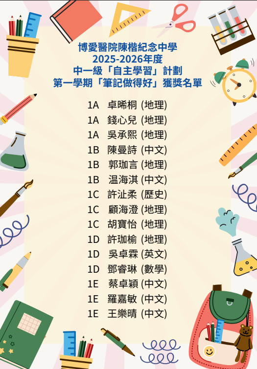 2025-2026年度 中一及中二級班際「筆記做得好」比賽 獲獎名單 |